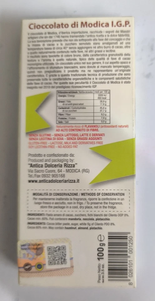 CIOCCOLATO DI MODICA FICHI BIANCHI ANTICA DOLCERIA RIZZA DAL 1935 100 G