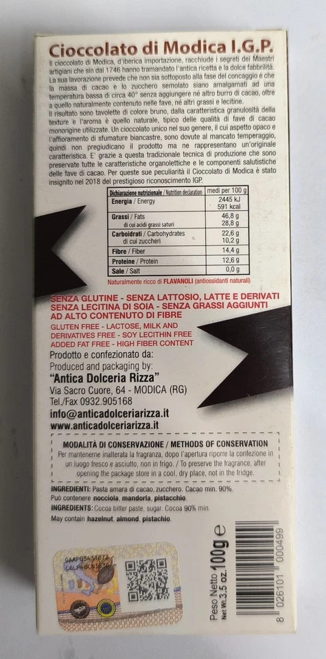 CIOCCOLATO DI MODICA 90 % ANTICA DOLCERIA RIZZA DAL 1935 100 G
